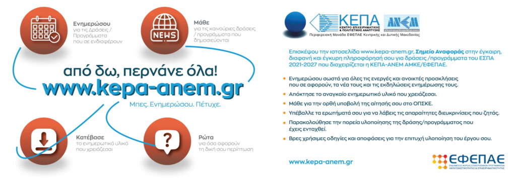 Βασικό πυλώνα επιτυχίας στην εκτέλεση του διαχειριστικού έργου της ΚΕΠΑ-ΑΝΕΜ, αποτελεί η υλοποίηση ενεργειών δημοσιότητας και πληροφόρησης, που υπηρετούν τον επικοινωνιακό στόχο των προγραμμάτων που αναλαμβάνει να διαχειριστεί και με σκοπό την μέγιστη δυνατή κινητοποίηση του επιχειρηματικού κόσμου της Κεντρικής και Δυτικής Μακεδονίας, για τις ευκαιρίες χρηματοδότησης και τη συμβολή της ΕΕ μέσω των Διαρθωτικών Ταμείων για τα αποτελέσματά τους.