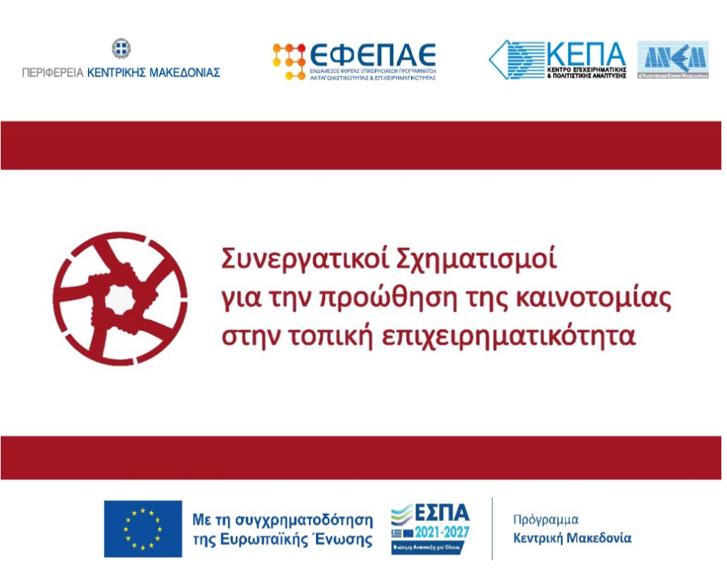 Στις 4/10/2024 η καταληκτική προθεσμία υποβολής των αιτήσεων χρηματοδότησης στη Δράση «Συνεργατικοί Σχηματισμοί για την προώθηση της καινοτομίας στην τοπική επιχειρηματικότητα» του Προγράμματος “Κεντρική Μακεδονία” ΕΣΠΑ 2021-2027.