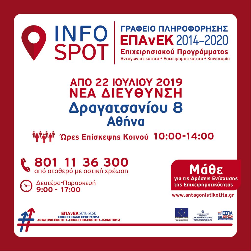 Από την ΕΥΔ/ΕΠΑνΕΚ ανακοινώνεται ότι  από 22 Ιουλίου 2019 η νέα διεύθυνση του Γραφείου Πληροφόρησης του Ε.Π «Ανταγωνιστικότητα, Επιχειρηματικότητα και Καινοτομία (ΕΠΑνΕΚ)», ΕΣΠΑ 2014 – […]