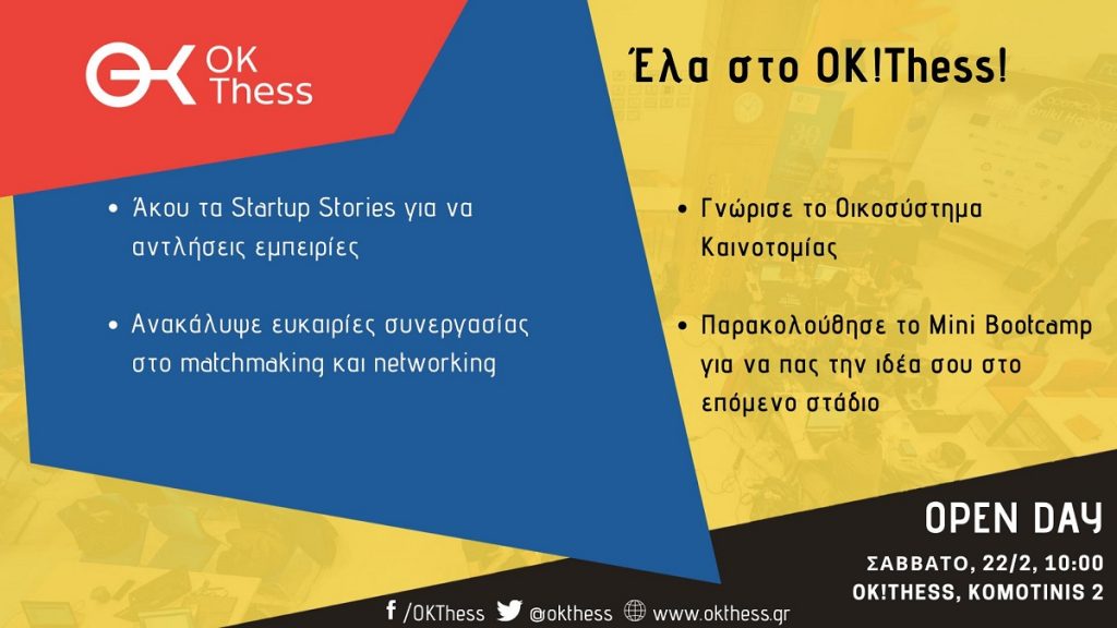Tο Σάββατο 22 Φεβρουαρίου και ώρα 10:00 στις εγκαταστάσεις του Κέντρου Καινοτομίας & Επιχειρηματικότητας OK! Thess θα πραγματοποιηθεί Open Day για να γνωρίσουν τις δράσεις και […]